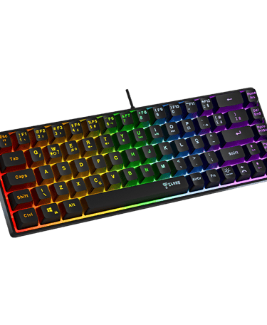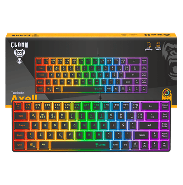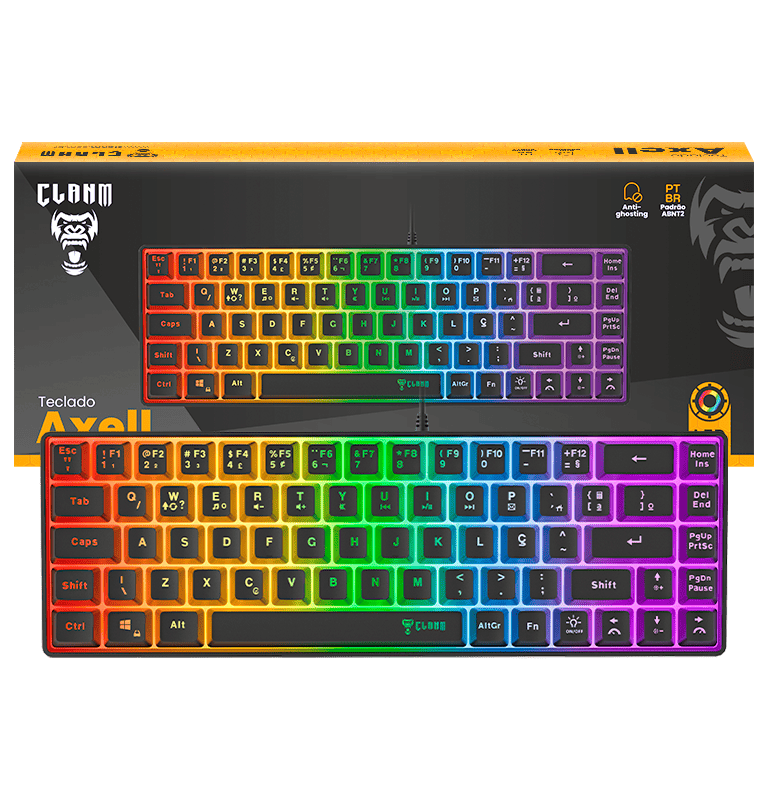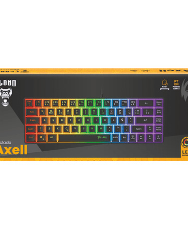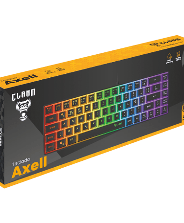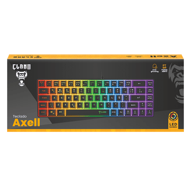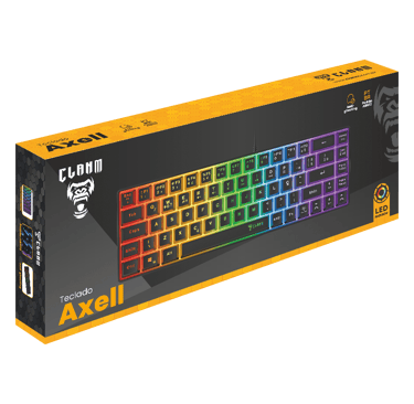 O teclado gamer 60% Axell da Clanm é um teclado compacto 60% (69 teclas) com design elegante em preto e iluminação LED Rainbow. Equipado com membrana tecnológica e keycaps backlight, oferece durabilidade e personalização.